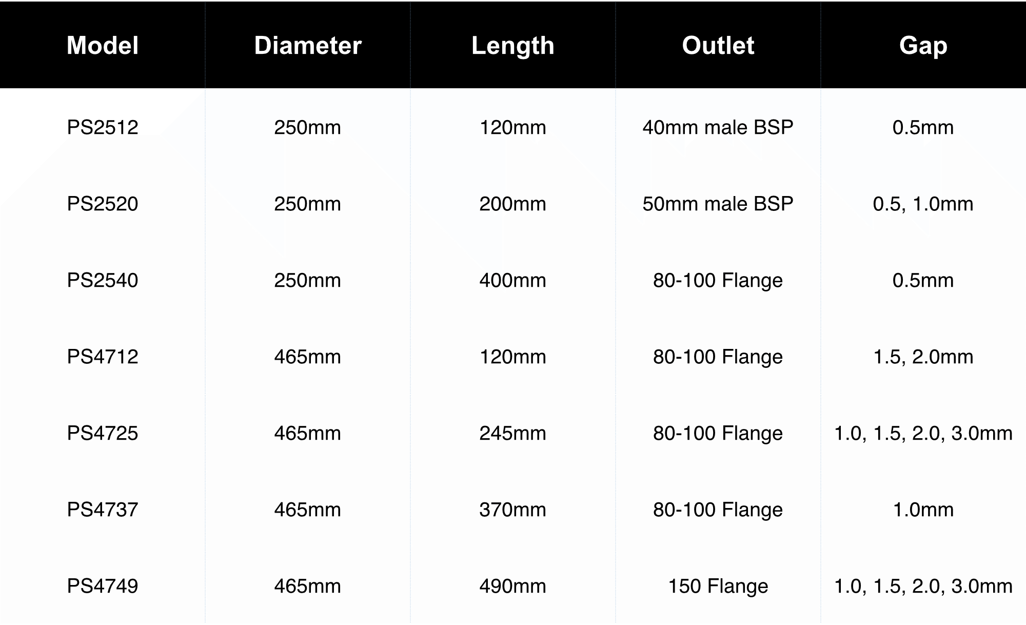 Our passive screens are constructed from stainless 3mm wedge-wire. As per the table below, there are varioius gap size options.